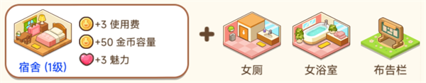 2、宿舍(1级)女厕+女浴室+布告栏使用费+3、金币容量+50、魅力+3