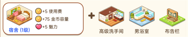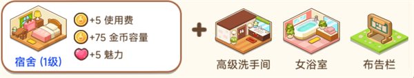 3、宿舍(进阶)高级洗手间+男浴室+布告栏使用费+5、金币容量+75、魅力+5