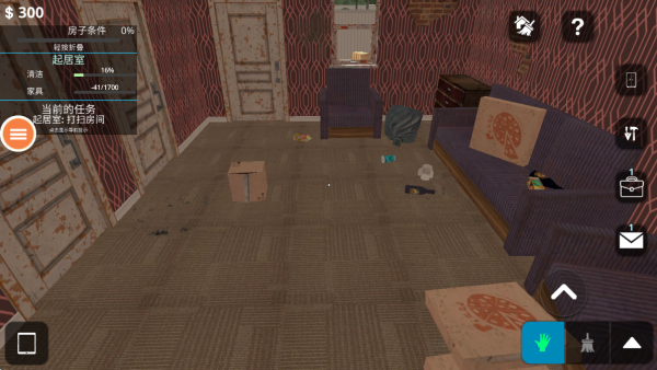 2、直接进入房间中,点击清理就房屋的垃圾,点击拾起垃圾,清空房间。