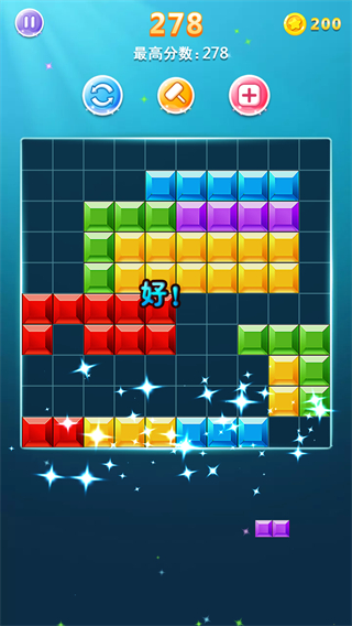 将屏幕下方的三个备选方块拖入宫格中,一行或一列铺满即可消除,直至备选方块无法放置,则消除游戏结束。