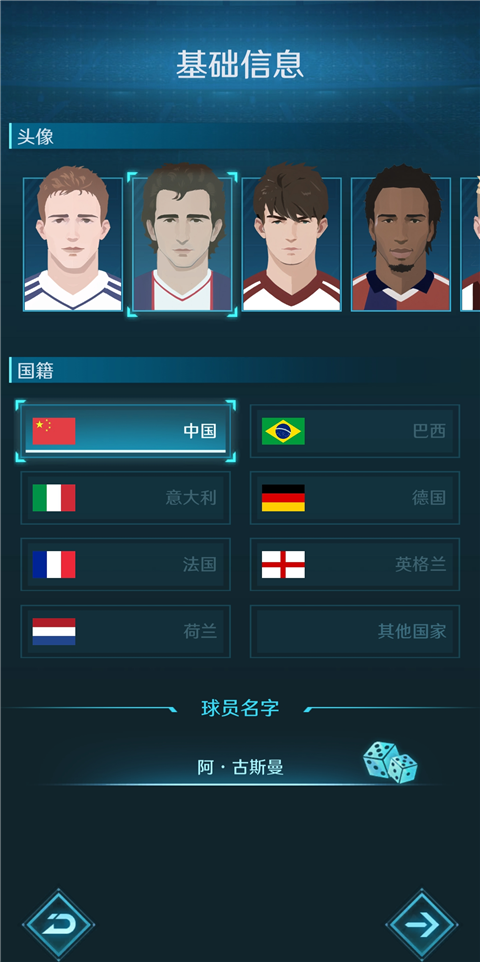 1、打开绿茵巅峰之路手游,进入生涯模式,开始需要创建球员,选择国籍、头像并设置昵称创建。