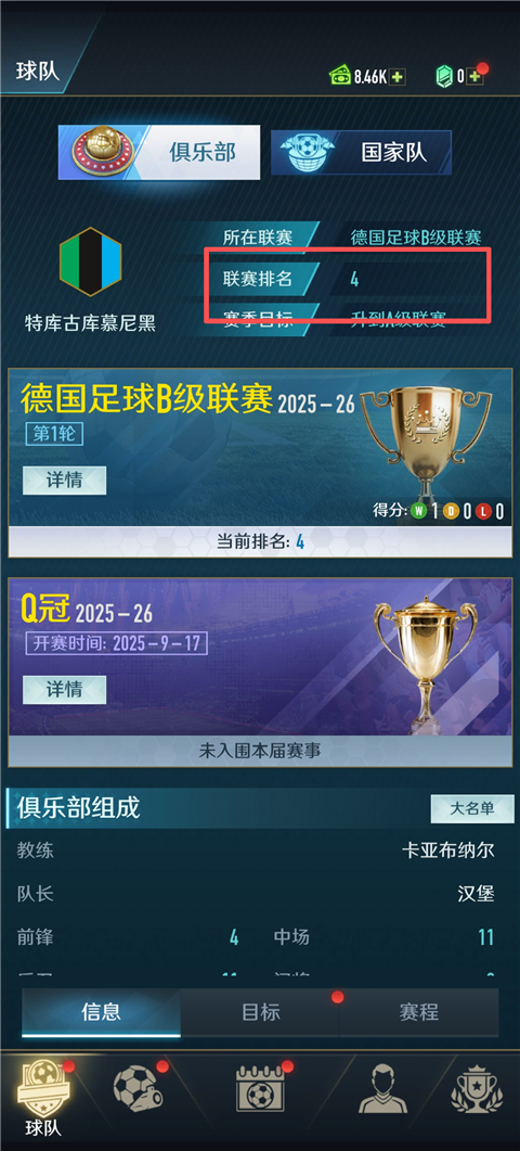 11、在球队界面,能看到当前球队的排名。