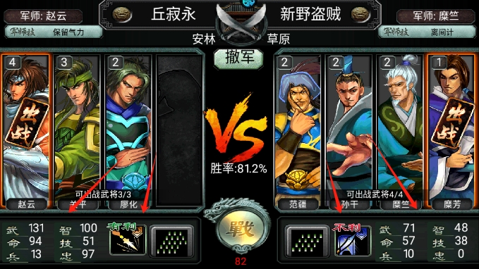 首选克制对方的兵种上场,若没有,选择互不相克的兵种上场。简单相克长枪兵克制—朴刀兵,朴刀兵克制弓箭兵,弓箭兵克制长枪。