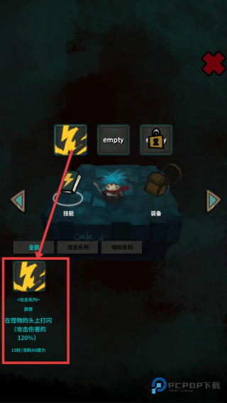 3、查看【技能】界面,了解角色技能,如攻击系列的【霹雳】该技能可在怪物头上打闪,造成攻击伤害的120%。