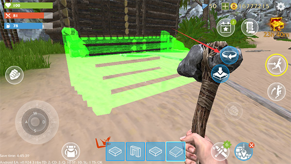 2、在首页中会有很多虚拟按键,拳头形状的攻击,圆形的是移动按钮,其他两个分别是背包和道具制作。