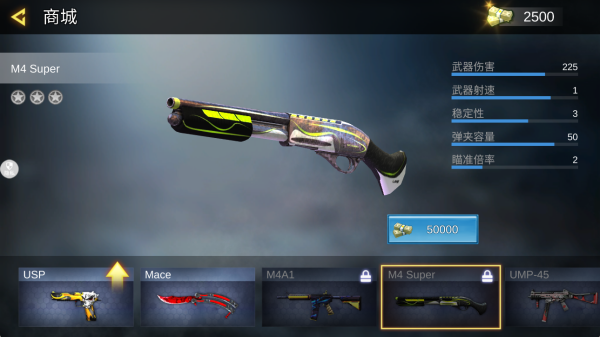 1、在商城中拥有不同的武器供玩家购买使用,近战枪支等应有尽有,还可以对武器升级。
