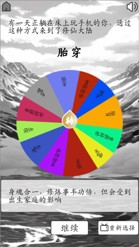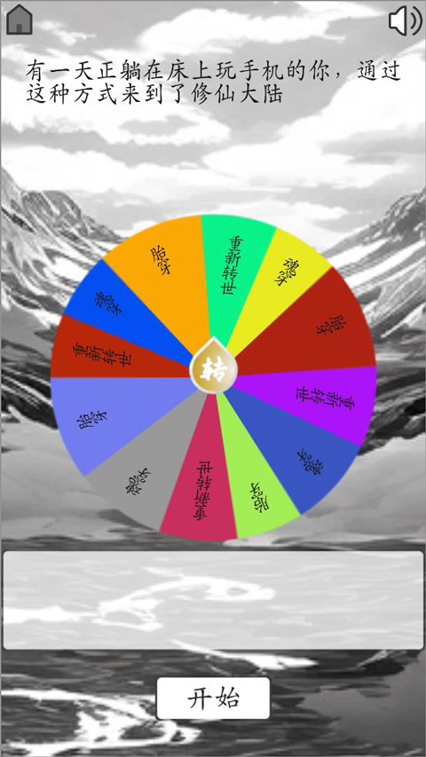 我靠转盘修炼成仙是一款文字修仙玩法的手游,以随机转盘为核心,修仙过程中的每一个事件都转化为不同主题的转盘,玩家可以通过点击的方式开始随机,指针落在哪一格,就会触发对应的修仙事件,通过不断转转盘来体验一个精彩的人生,每一次重开都是全新的人生,每局都会呈现不同的经历。