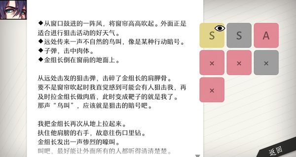 A级结局:远处传来一声不自然的鸟叫——子弹——从窗口鼓进的一阵风——金组长。