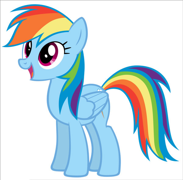 天蓝色身体,彩虹色鬃毛,瑰红色眼睛的小马。可爱标志为一朵云下面有一道彩虹闪电。