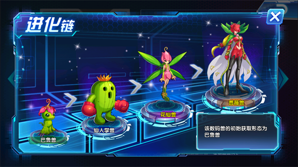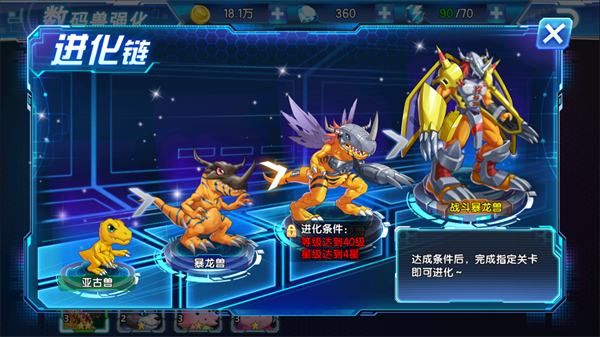 -进化:阶段进化:幼年期→成长期→成熟期→完全体→究极体(需对应进化材料和数码兽碎片)。