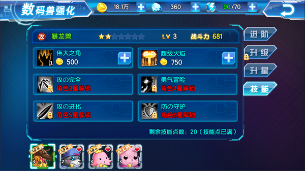 -主动技能:消耗技能书或同名数码兽提升技能等级,优先升级核心输出技能。