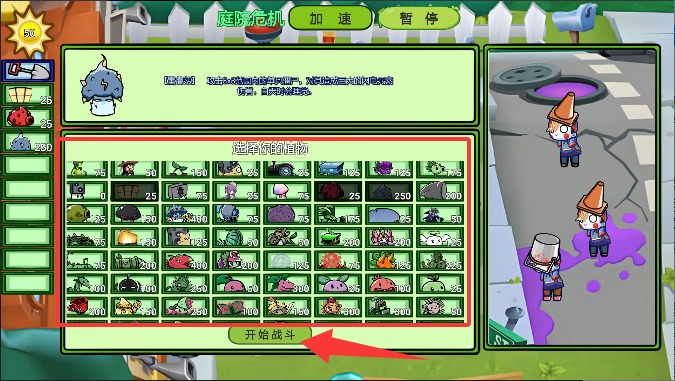 3、选择庭院危机这个关卡,然后开始你的自由布局战斗之旅吧。