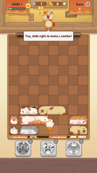只需左右滑动屏幕,即可移动猫咪位置,让相同角色在横纵方向上连成一线。一旦达成三连或更多,就能瞬间完成消除,带来流畅爽快的操作体验。规则简洁明了,新手也能快速掌握,随时随地开启一段治愈又烧脑的拼图之旅。