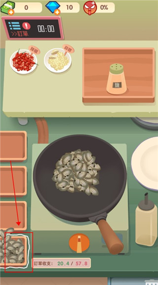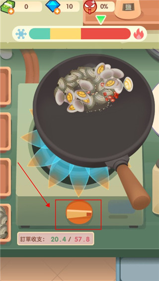 5、然后点击食材,再点击锅底就可以放置食材,我们需要根据成本酌情放置食材