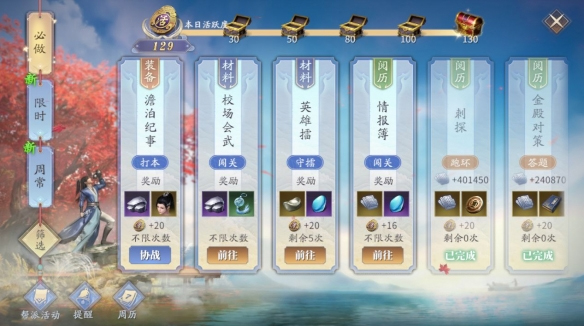 参与答题,无论对错都可以获得见识和阅历,答错了获得的见识减半;累积答对四次可以获得银子。每天答完五题之后,便不能再获得奖励。答题耗时短,奖励性价比极高,且具有一定趣味性,建议全部完成。