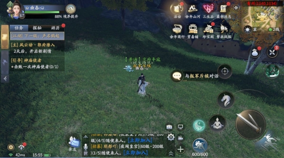 【问剑】每日刷新的组队PVE任务,玩家以组队的形式与各大门派进行切磋,可以获得阅历与中品级装备。一天能完成五次,建议全部清完。连组队到完成大概不到10分钟,收益却十分可观!