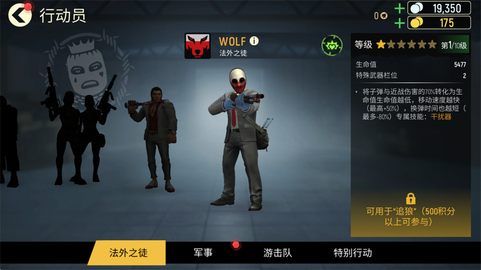 ●将子弹与近战伤害的70%转化为生命值生命值越低,移动速度越快(最高+50%),换弹时间也越短(最多-80%)专属技能:干扰器