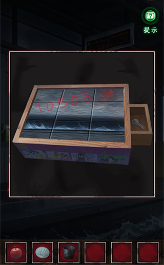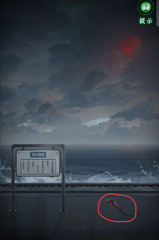 12、然后玩家们就可以得到黑蜡笔和空水桶,回到候车厅在拼图上面将海浪涂成黑色,把月亮涂成红色,然后就可以拿到钥匙了;