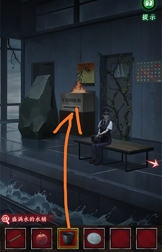 16、回到站台使用空桶装满水,然后根据笔记本里面的记录后对着桶使用火柴,然后在使用玩家们在电车里面得到的苹果;