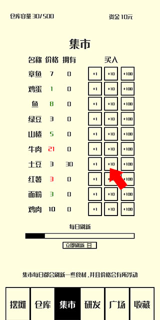 4、之后回到摆摊界面即可看到仓库库存多了土豆,并且炸薯片也可以正常制作了