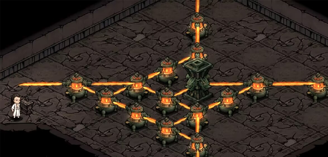 用拉杆通过中央铜柱之火引入火炉清除四角的木人。注意炉子的嘴朝向,大部分情况下按着下面图片摆就行