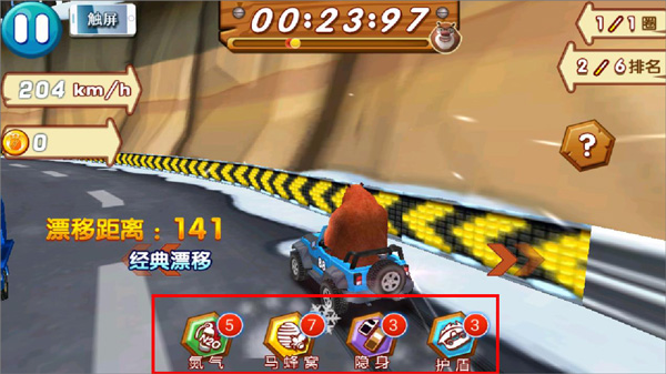 4、在游戏中玩家可使用道具帮助自己通关,道具有氮气、马蜂窝、护盾、隐身功能等。