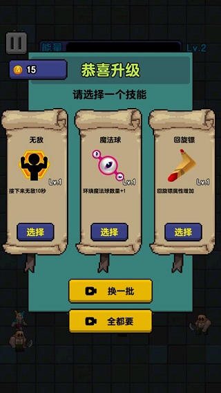 2、打怪掉落的能量,可以提升人物等级,每次升级你都可以选择一个技能,如图: