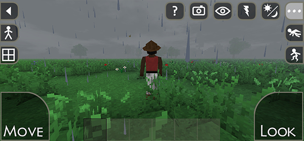 7、右上角的功能按钮分别可以控制角色的视角、控制场景的天气等,我们要做的就是在这个地图中存活下去。