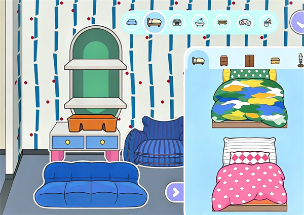 新增两款极具特色的床:一款是迷彩撞色设计,另一款则是粉白波点搭配菱格枕头,富有趣味与独特的视觉感受。