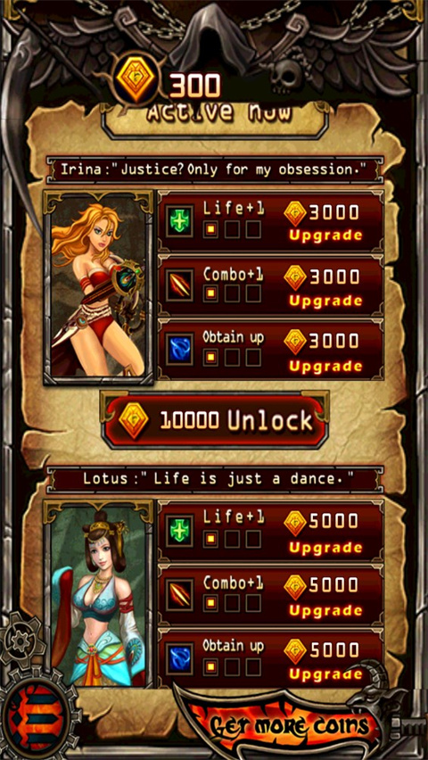 5、游戏一共有4个角色分别为:Talos、Irina、Lotus和Cirk,初始角色是Talos,其余三个角色需要一定的金币解锁,金币可以从游戏中获得。不同的主角具有不同的华丽攻击特性,战刃、魔法、暗器应有尽有。还有多种趣味道具和技能,能够帮你冲击更高分。