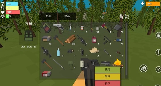 3、游戏以生存为挑战目标,我们的角色有血量、有体力、会饥饿、会口渴,我们在小镇中四处寻找食物和资源