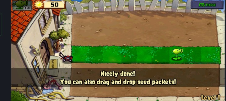 3、可以看到左上角有豌豆射手和太阳,第一关的一个太阳是25的能量,需要4个太阳即可种植一个豌豆
