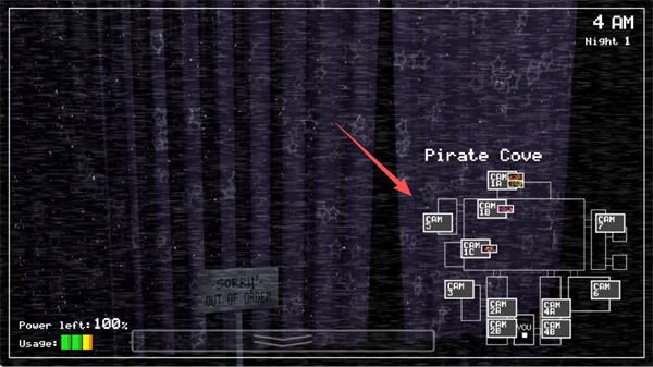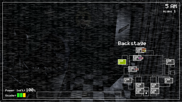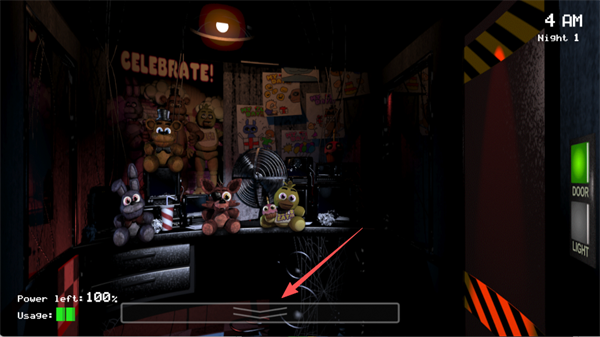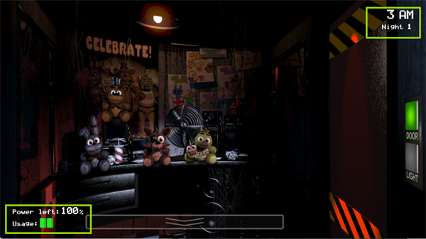 右上角显示的是当前夜晚的时间和第几个夜晚。当时间走到6 AM时,白天会到来,代表你顺利度过了这一夜,也就成功通过了这一关。左下角则是监控室内灯光的电量,务必注意节省能源。如果灯光电量用尽,你就只能依靠其他方法来应对玩具熊,可能会很危险哦。