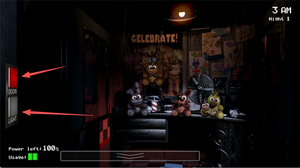 监控室的界面有两边,分别是左侧和右侧。点击屏幕左半部分,可以移动到监控室的左侧;右半部分则切换到右侧。每一边都有一道门,门旁分别有两个按钮:DOOR(控制门的开关)和LIGHT(打开灯)。这些按钮是你防范玩具熊攻击的重要工具。