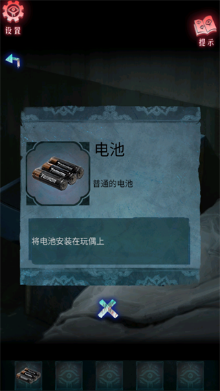 收集的道具会存入背包,点击即可选中,再点击场景中的目标物品就能使用(比如用电池给企鹅玩偶供电)。