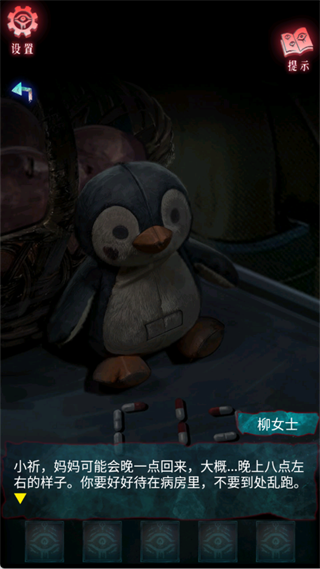 1、根据提示打开左边床的床头柜拿到电池,给小企鹅装上,听妈妈的语音,要去拿药但是门锁住了。
