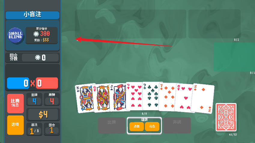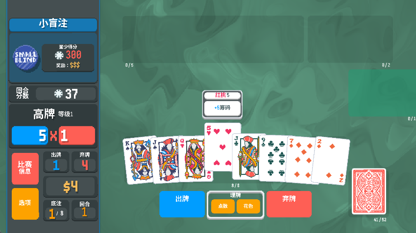 阴险小丑:如果出牌中包含一个顺子,+100筹码。