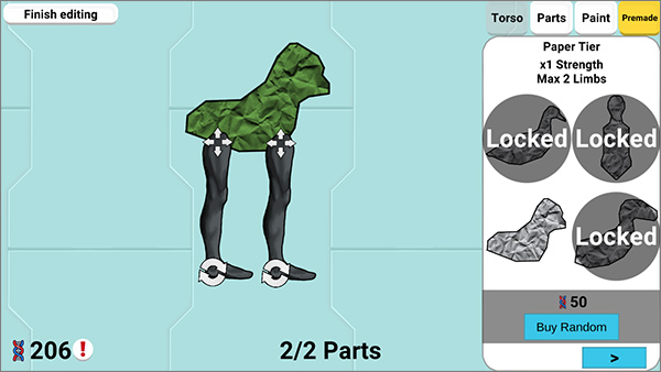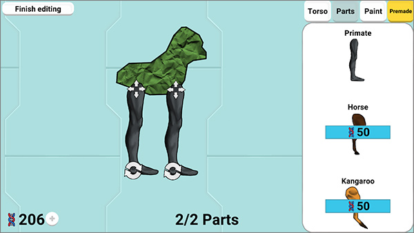 4、点击“parts”玩家可以选择生物行走是用什么动物的脚,将脚移动到生物主体上即可;