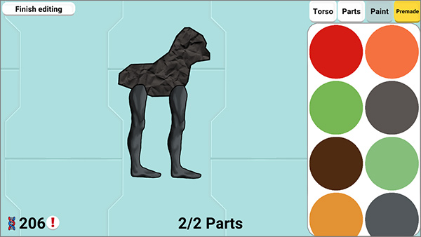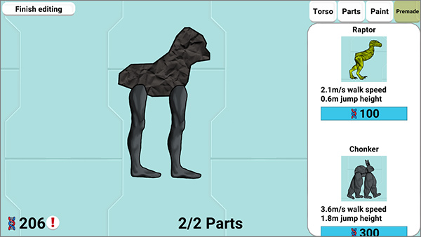 1、部件自由组合:提供庞大的生物部件库,包括躯干、四肢、颜色等选项,玩家可自由搭配设计个性化生物,打造专属进化路线。