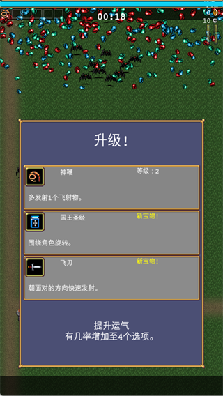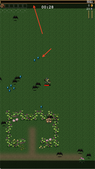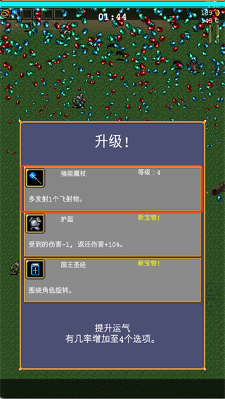 击杀敌人会掉落蓝色经验宝石,拾取后角色升级,每升一级可从3个选项中选择武器/被动道具强化自己。