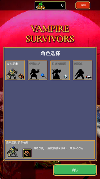 安东尼奥(初始角色):自带武器“神鞭”,被动每10级伤害+10%,最高+50%,是新手最容易上手的角色。