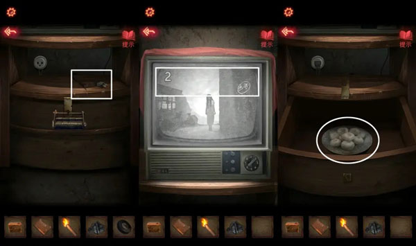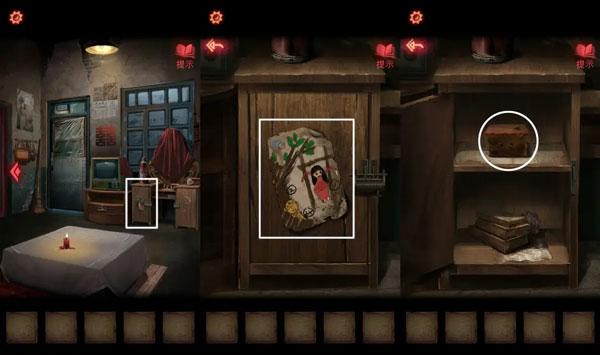 9、【煤油灯】在桌上的蜡烛点燃,进入房间。根据【反字日记】上的提示,调整架子上的物品,拿到【唱片】。架子上拿到【铅笔】,日记本往后翻页拿到【半张照片】。