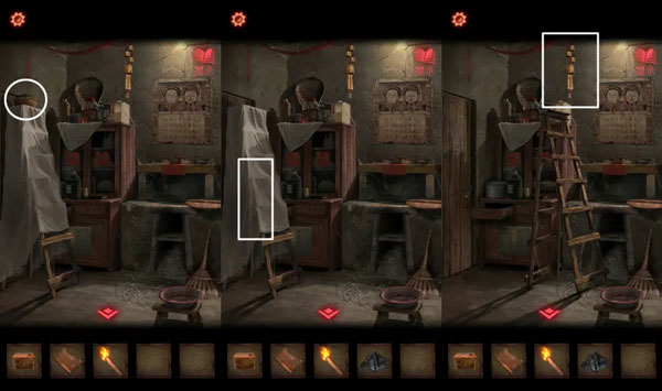 3、梯子上拿到【煤炭】,点击梯子上的布,再点击梯子移动到中间,点击天花上的铃铛。