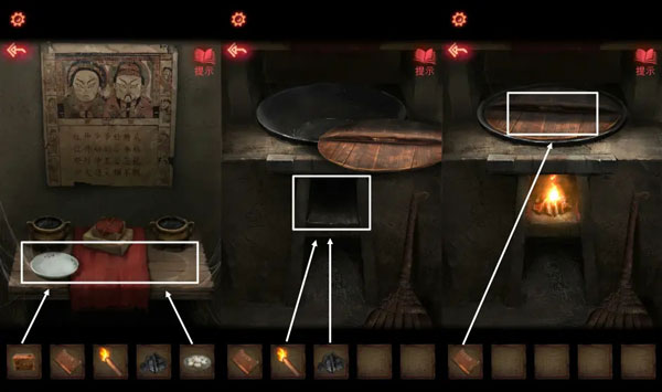 6、将【枣糕】和【糖瓜】放在桌上,【煤炭】放灶台下,【引火棒】点燃。点击锅盖盖上,将【湿日记本】放在锅盖上,拿到【反字日记】。