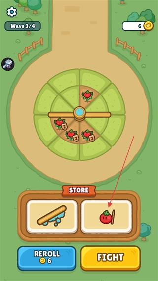 1、处于关卡闯关环节时,在STORE里挑选番茄植物放置到圆盘的空位上,等所有操作都完成后,就可以准备点击FIGHT了。