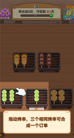 1、首先记得拖动烤串,三个相同烤串可合成一个订单。