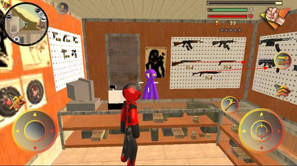 左侧移动、加速,右侧绳索,攻击(跳跃),跳跃,右上侧的武器更换以及血量、经验的显示都实时更新,一览无遗,凭借着大家自由的玩法,与其他帮派的人物进行交火,期间杀人能够获得经验,杀多了会产生星级,警察和其他附近角色会特殊照顾你对你展开火热的进攻,而如何存活,如何将其他人物击杀则是你所需要完成的任务。