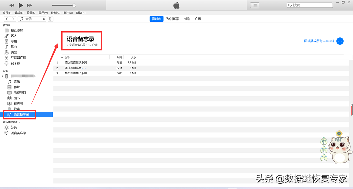 苹果手机录音怎么批量导出?通过iTunes同步语音备忘录的方法可以直接在电脑上使用iTunes播放,但是却不能断开手机,而利用数据蛙苹果恢复专家可以一次性将语音备忘录导到电脑中,什么时候播放都行,并且还可以将删除了的语音备忘录重新找回来。