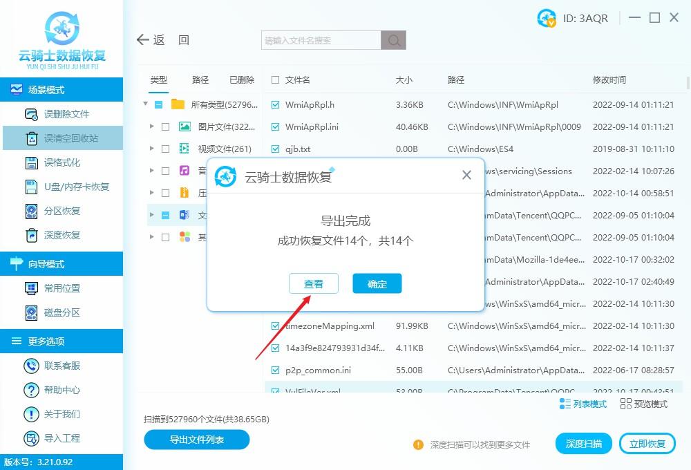如果回收站已经被清空上述方法是行不通的,那么回收站清空的文件怎么恢复呢?其实不论是前一天清空的回收站文件,还是今天清空的回收站文件,只要没有往丢失文件所在磁盘写入新的文件,我们都可以借助恢复回收站文件工具进行恢复,如果您担心收费的问题,建议您可以先使用支持免费扫描和预览的软件,能有效避免找不到文件还要付费的烦恼,这里推荐你使用的恢复回收站文件软件是——云骑士数据恢复软件,该软件适用的数据丢失场景广泛,如恢复已清空的回收站文件、恢复误删除文件、恢复格式化丢失文件等。支持各类存储介质的文件恢复,如恢复电脑、硬盘、U盘、回收站、内存卡、相机等,只要能扫描出所需文件且能正常预览都是可以恢复。