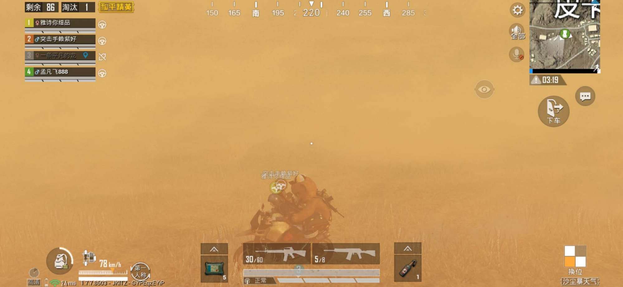 一个战术是什么战术呢?请小伙伴们看上面的图片,没错,这个战术就是找车转移。在普通模式中找车转移比城区刚枪以及野区发育都要好一些,因为找车转移可以让玩家离开航线范围,不管是搜集物资的时候,还是转移的时候,都相对来说更安全一些。但是在沙尘暴天气中,找车转移无疑成了一个非常难的挑战。为啥嘞?因为能见度真的是太低了,玩家离地面还剩下四五米的时候都看不到地面的情况,所以在空中根本看不到哪里有车,又谈何转移?就算找到了车,你真的敢转移吗?说实话,在沙尘暴天气中开车真的是一个技术活,龙百万开了不到100米,撞了2次石头2次树,血量掉了1/3。